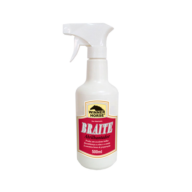 O Braite Abrilhantador desembaraça, amacia, fortalece evitando a quebra dos fios, dá brilho a crina, cauda e pelagem. Facilita a escovação, impede a aderência de poeira e serragem. Não é óleo nem creme rinse. Braite pode ser usado ao sol, não queima a pelagem.
